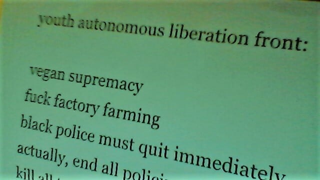 The Youth Autonomous Liberation Front (YALF)'s seminal poster-zine describing central principles. One page zine: paste it to your wall, or order bulk and airdrop.